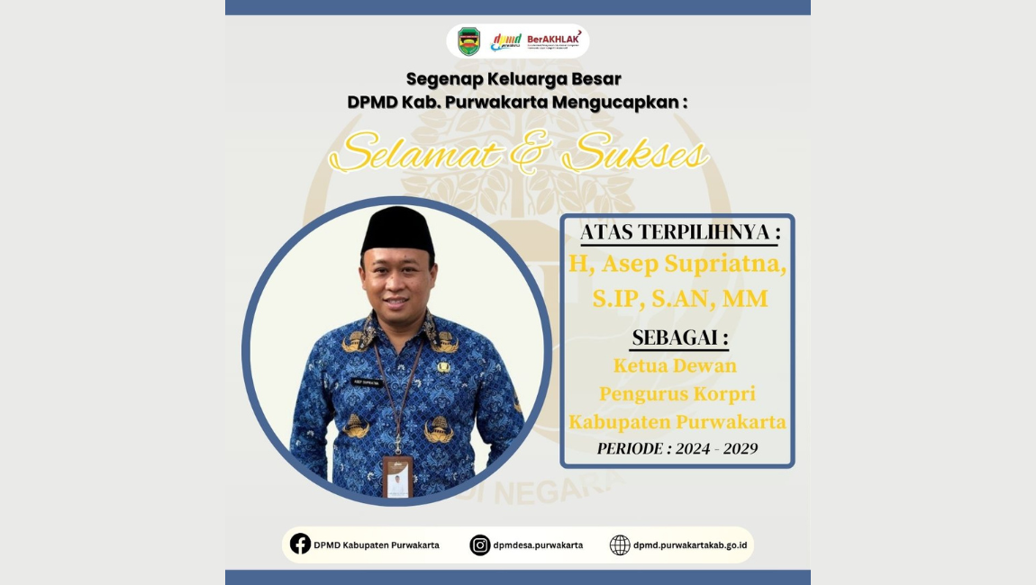 Selamat & Sukses atas terpilihnya H. Asep Supriatna, S.IP, S.AN, MM. Sebagai Ketua Dewan Pengurus KORPRI Kab. Purwakarta Periode 2024 - 2029